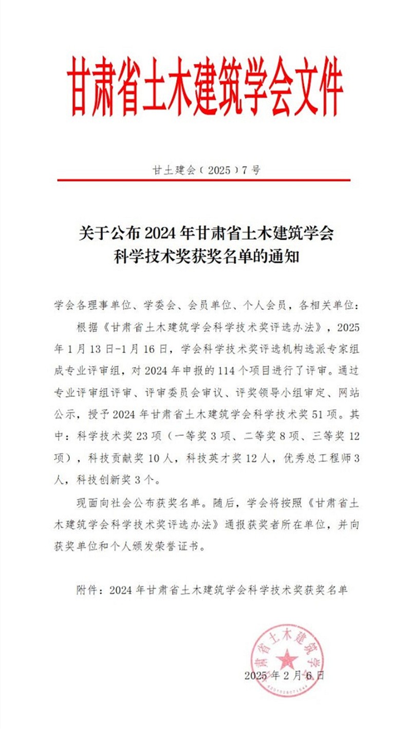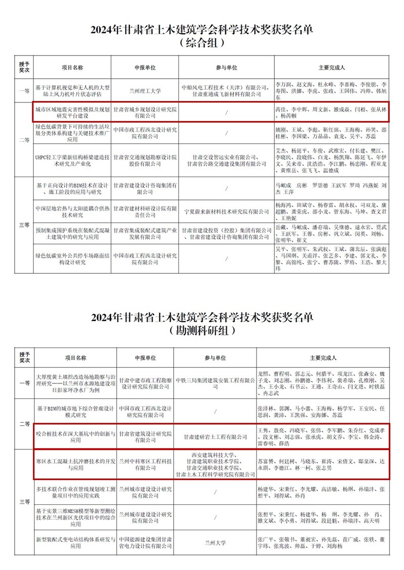 近日,2024年甘肅省土木建筑學(xué)會科學(xué)技術(shù)獎獲獎結(jié)果公布,甘肅工程咨詢集團斬獲多項榮譽。其中,省建筑設(shè)計院申報的《咬合樁技術(shù)在深大基坑中的創(chuàng)新與應(yīng)用》項目榮獲“科學(xué)技術(shù)獎(勘測科研組)二等獎”,省城鄉(xiāng)規(guī)劃院申報的《城市區(qū)域地震災(zāi)害模擬及規(guī)劃研發(fā)平臺建設(shè)》項目榮獲“科學(xué)技術(shù)獎(綜合組)二等獎”,土木工程院參與的《寒區(qū)水工混凝土抗沖磨技術(shù)的開發(fā)與應(yīng)用》項目榮獲“科學(xué)技術(shù)獎(勘測科研組)三等獎”。省建筑設(shè)計院、省城鄉(xiāng)規(guī)劃院4人分別榮獲“科技貢獻獎”“科技英才獎”“科技貢獻獎”“優(yōu)秀總工程師獎”等榮譽稱號。