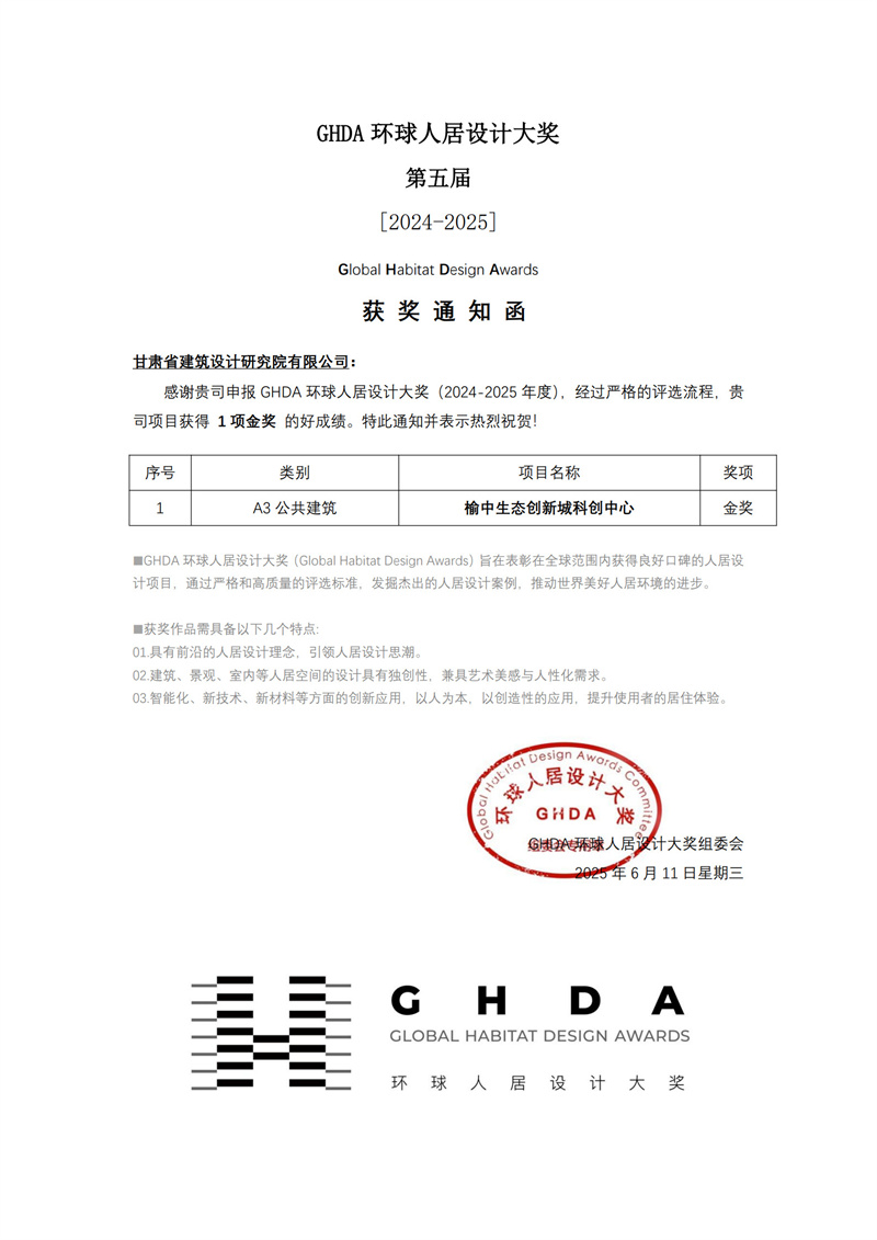 近日,備受矚目的第五屆GHDA環(huán)球人居設(shè)計大獎獲獎名單揭曉。甘肅工程咨詢集團旗下省建筑設(shè)計院精心打造的榆中生態(tài)創(chuàng)新城科創(chuàng)中心項目,繼榮獲美國綠色建筑委員會頒發(fā)的LEED V4 BD+C鉑金級預(yù)認證、中國綠色建筑三星級預(yù)評價兩項權(quán)威認證后,再度摘得公共建筑類金獎,彰顯出我省在人居設(shè)計領(lǐng)域的卓越實力。