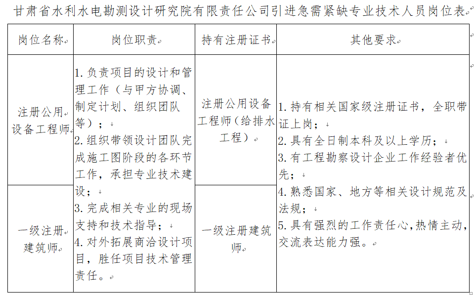本次引進(jìn)的具體崗位及資格條件詳見(jiàn)《甘肅省水利水電勘測(cè)設(shè)計(jì)研究院有限責(zé)任公司引進(jìn)急需緊缺專業(yè)技術(shù)人員崗位表》(附件1)。