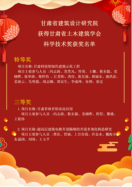 近日,從甘肅省土木建筑學(xué)會(huì)傳來(lái)好消息,建筑設(shè)計(jì)院選送的“甘肅科技館綠色建筑示范工程”“甘肅省體育館表皮應(yīng)用”“超高層建筑電梯井道隔墻的井道多效化構(gòu)造研究”等項(xiàng)目被該學(xué)會(huì)分別授予科學(xué)技術(shù)獎(jiǎng)特等獎(jiǎng)和三等獎(jiǎng)。