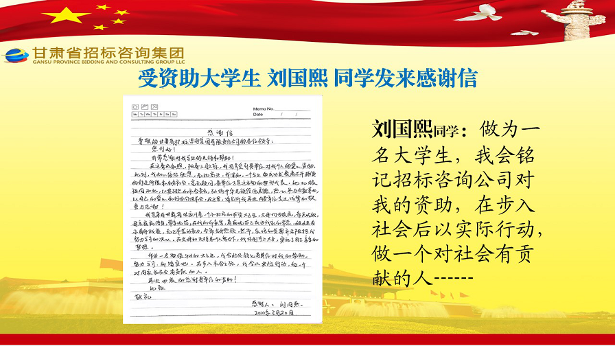 近日,張家川縣張棉驛鄉(xiāng)張棉村貧困大學(xué)生代表劉國(guó)熙、周長(zhǎng)斌、李雪峰等向甘肅省招標(biāo)咨詢集團(tuán)有限責(zé)任公司發(fā)來(lái)感謝信,就招標(biāo)咨詢集團(tuán)給予學(xué)費(fèi)資助一事表達(dá)他們的感激之情。