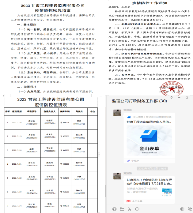 面對疫情“大考”,甘肅建筑設計院以高度的責任感守護疫情防控的“省院”防線,在阻擊疫情方面,堅持聞令而動、令行禁止,做好自身防護的同時,選派干部響應號召下沉街道,派出志愿者助力轄區(qū)防控,把省市的各項防控舉措落實落細落到位;在生產經營方面,發(fā)揮科技企業(yè)優(yōu)勢,統籌把握疫情防控與重點工程服務保障的關系,做到勘察服務準時高效、外業(yè)作業(yè)安全有序,把損失降到最低。建筑設計院各生產單位扭住關鍵點、打好主動戰(zhàn),用一項項“硬核”舉措實現“自救”解困。瞧!這里就有一份來自建筑設計院子公司監(jiān)理公司的“戰(zhàn)報”。