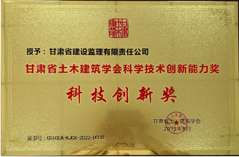 近日,省建設(shè)監(jiān)理公司榮獲“甘肅省土木建筑學(xué)會科技創(chuàng)新獎”。此獎項(xiàng)充分肯定了公司核心技術(shù)能力,彰顯了公司的品牌實(shí)力和行業(yè)影響力。