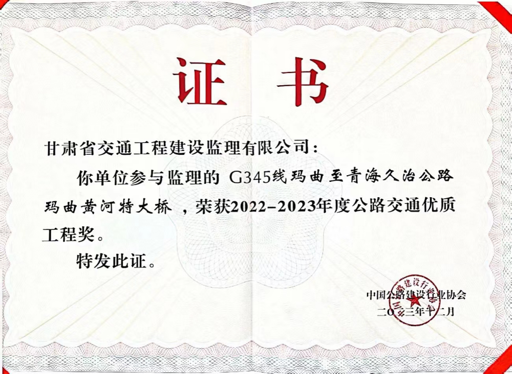 近日,中國(guó)公路建設(shè)行業(yè)協(xié)會(huì)于湖北武漢召開第五屆公路建設(shè)高質(zhì)量大會(huì)暨2022-2023年度公路交通優(yōu)質(zhì)工程獎(jiǎng)表彰大會(huì)。省交通監(jiān)理公司“代建+監(jiān)理”的G345線瑪曲至青海久治公路瑪曲黃河特大橋榮獲公路交通優(yōu)質(zhì)工程獎(jiǎng)。此次獲獎(jiǎng)系公司在兩徽、金阿高速公路之后第三次獲得全國(guó)公路交通優(yōu)質(zhì)工程獎(jiǎng)——李春獎(jiǎng)。