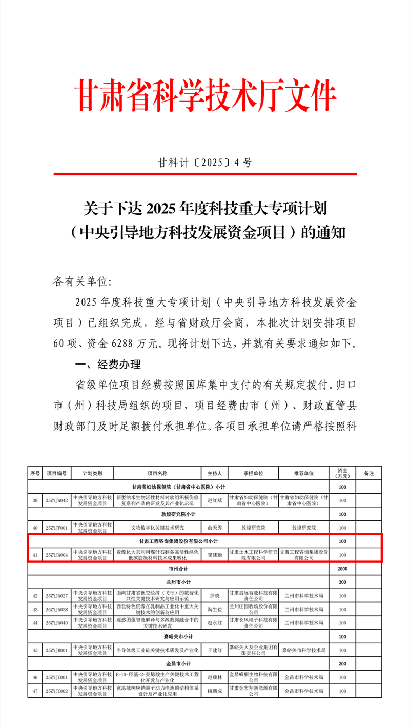 近日,甘肅省科技廳公布了2025年度科技重大專項計劃(中央引導(dǎo)地方科技發(fā)展資金項目)立項名單,土木工程院主持申報的“資源化大宗利用煤矸石制備高活性綠色低碳膠凝材料技術(shù)成果轉(zhuǎn)化”項目成功立項。