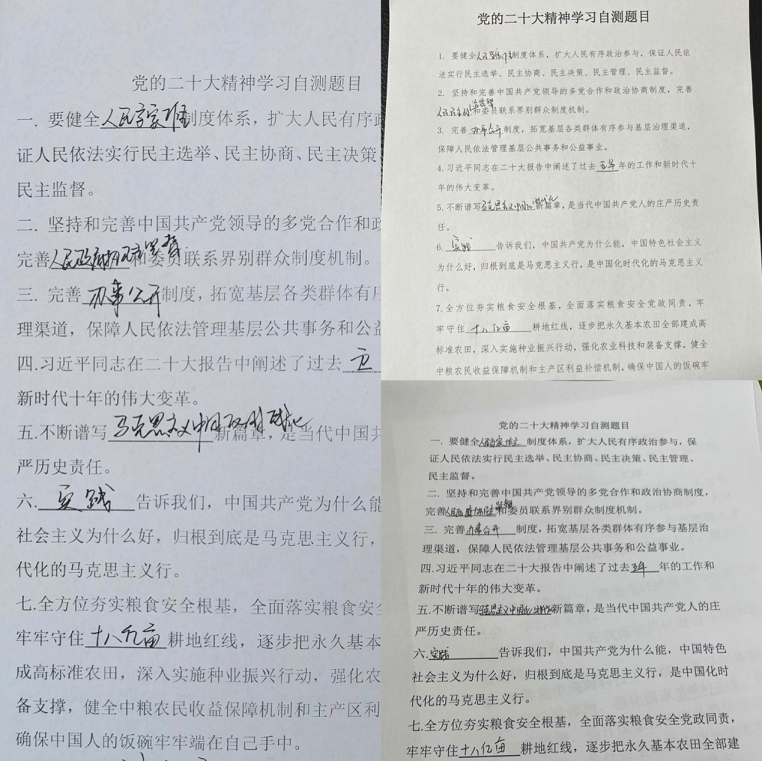 開展答卷測(cè)試,檢驗(yàn)學(xué)習(xí)成效。招標(biāo)咨詢集團(tuán)第三黨支部所屬咨詢中心采取線上視頻會(huì)議的方式組織全體黨員居家學(xué)習(xí)黨的二十大報(bào)告原文,通過學(xué)原文、悟原理、反復(fù)學(xué)、時(shí)常悟,深刻領(lǐng)會(huì)和準(zhǔn)確把握?qǐng)?bào)告的精神實(shí)質(zhì)、豐富內(nèi)涵和核心要義。同時(shí),對(duì)黨的二十大報(bào)告相關(guān)知識(shí)開展應(yīng)知應(yīng)會(huì)測(cè)試,通過答卷的方式檢驗(yàn)黨員干部對(duì)黨的二十大精神的理解和把握,達(dá)到以考促學(xué)、以學(xué)促用、學(xué)用結(jié)合、知行合一的目的。