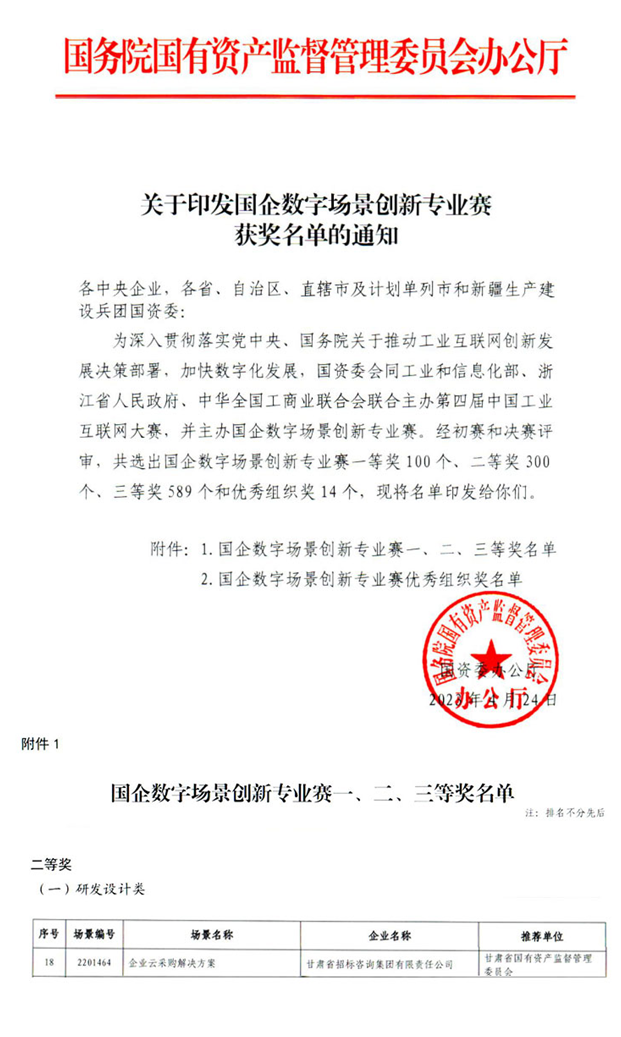 近日,國務(wù)院國資委公布了首屆“國企數(shù)字場(chǎng)景創(chuàng)新專業(yè)賽”獲獎(jiǎng)名單。甘肅工程咨詢集團(tuán)組織推薦的“甘招企業(yè)云采購平臺(tái)”創(chuàng)新場(chǎng)景,在全國2007家參賽企業(yè)推薦的3277個(gè)場(chǎng)景中脫穎而出,榮獲二等獎(jiǎng)!