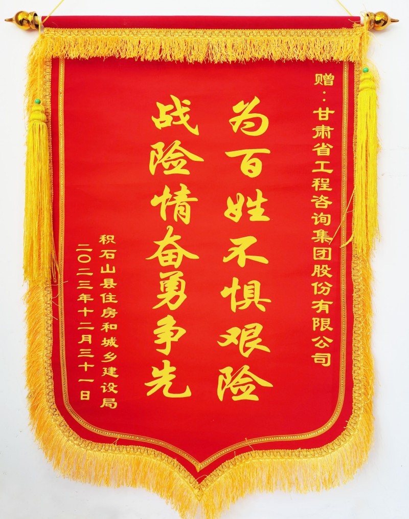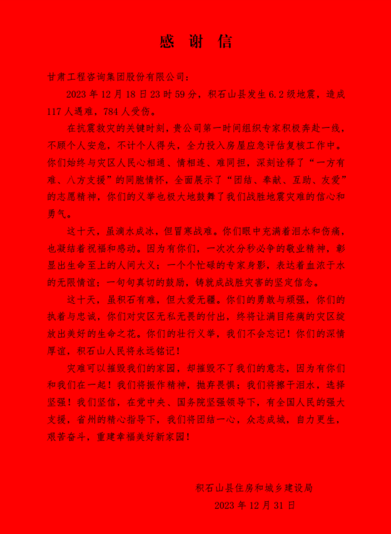 1月3日上午,積石山縣住房和城鄉(xiāng)建設(shè)局向甘肅工程咨詢集團(tuán)贈(zèng)送“為百姓不懼艱險(xiǎn),戰(zhàn)險(xiǎn)情奮勇?tīng)?zhēng)先”錦旗,并發(fā)來(lái)《感謝信》,對(duì)在抗震救災(zāi)關(guān)鍵時(shí)刻奔赴災(zāi)區(qū)開(kāi)展房屋應(yīng)急評(píng)估工作的專家表達(dá)感謝和敬意。