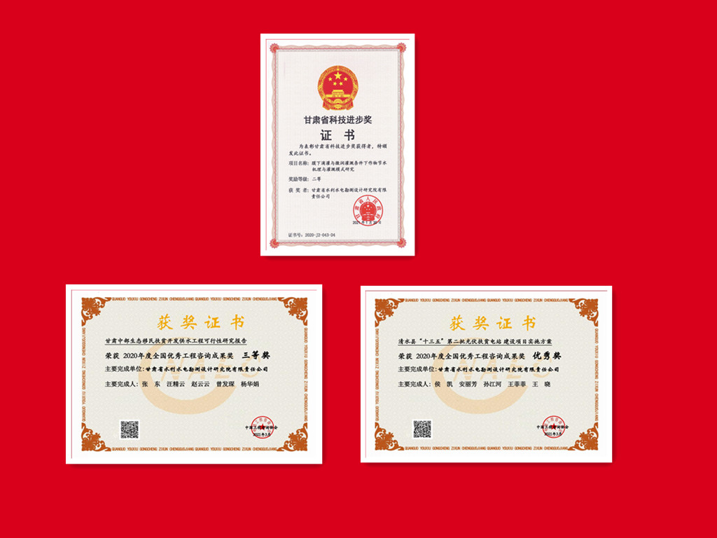 科研成果在工程實(shí)踐中開(kāi)花結(jié)果,多個(gè)項(xiàng)目獲技術(shù)表彰獎(jiǎng)勵(lì):《民勤縣紅崖山水庫(kù)加高擴(kuò)建工程》獲甘肅省優(yōu)秀工程勘察設(shè)計(jì)一等獎(jiǎng);《石羊河流域重點(diǎn)治理項(xiàng)目西營(yíng)河專(zhuān)用輸水渠工程》《古浪縣生態(tài)移民暨扶貧開(kāi)發(fā)黃花灘項(xiàng)目水利骨干工程》《大通河納子峽水電站工程地質(zhì)勘察》《昌馬水庫(kù)樞紐工程地質(zhì)勘察》分別獲甘肅省優(yōu)秀工程勘察設(shè)計(jì)二等獎(jiǎng);《甘肅中部生態(tài)移民扶貧開(kāi)發(fā)供水工程可行性研究報(bào)告》獲全國(guó)優(yōu)秀工程咨詢成果獎(jiǎng)三等獎(jiǎng);《清水縣“十三五”第二批光伏扶貧電站項(xiàng)目》獲全國(guó)優(yōu)秀工程咨詢成果獎(jiǎng)優(yōu)秀獎(jiǎng)。